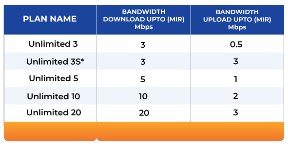 Unlimited Plans can range from 3Mbps to 20Mbps on download and 1Mbps to 3Mbps on upload.